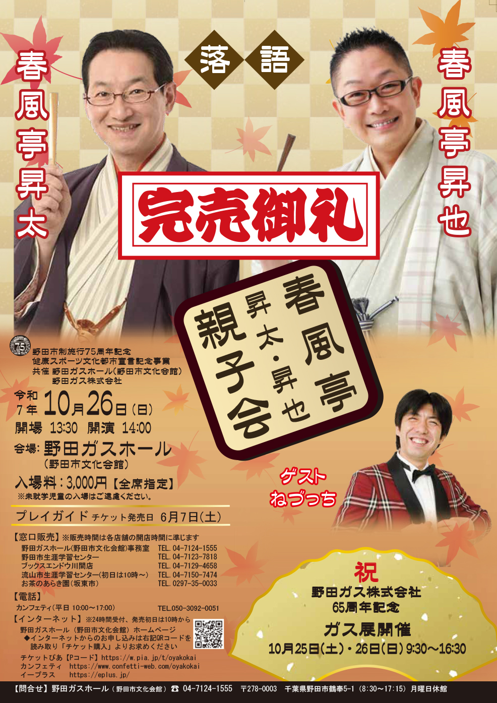チケット取扱い | 【窓口販売】 [野田ガスホール(野田市文化会館)] 04-7124-1555 ※月曜日、年末年始休館 [野田市生涯学習センター]04-7123-7818 ※年末年始休館 [ブックスエンドウ川間店]04-7129-4658 ※店舗休業日に準ず [流山市生涯学習センター]04-7150-7474 ※初日は10時から。第三水曜日、年末年始休館 [お茶のあらき園(坂東市)]0297-35-0033 ※店舗休業日に準ず 【電話予約】 [カンフェティ]050-3092-0051(平日10:00~17:00※オペレーター対応) 【WEB予約】 [野田ガスホール]ホームページ https://www.noda-bunka.jp [チケットぴあ]https://w.pia.jp/t/ [カンフェティ]https://www.confetti-web.com/@/ [カンフェティ]https://eplus.jp/ |