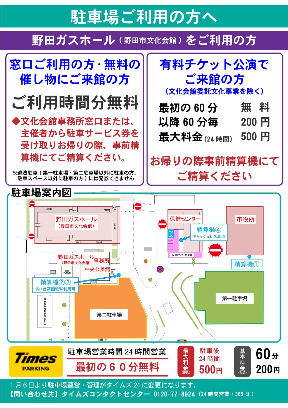 | 市では、本庁舎駐車場の混雑が問題となっており、用事のない方の利用が原因の一つとなっています。適正な利用を促し混雑を緩和するため、令和8年1月から目的外利用者の駐車場利用が有料となります。1時間を超過して利用する場合は、無料券を各課窓口か総合案内で配布しますので、精算機にて清算手続きを行ってください。有料となる方は、野田ガスホール(野田市文化会館)で開催される商業目的の有料イベントや市役所に用事がない方です。 |