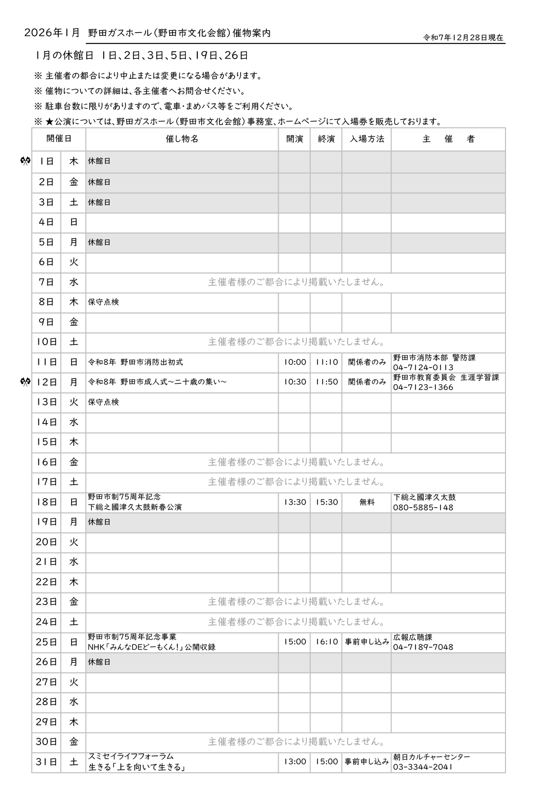 催し物案内(2026年1月)