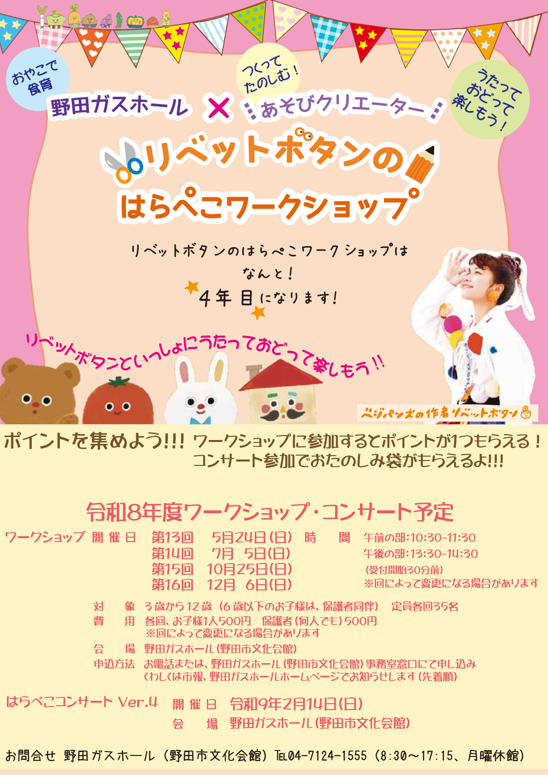 第13回 5月24日(日) 第14回 7月 5日(日) 第15回 10月25日(日) 第16回 12月 6日(日) 午前の部/10:30-11:30 35組(受付開始30分前) 午後の部/13:30-14:30 35組(受付開始30分前) ※回によって時間が変わる場合があります。 |