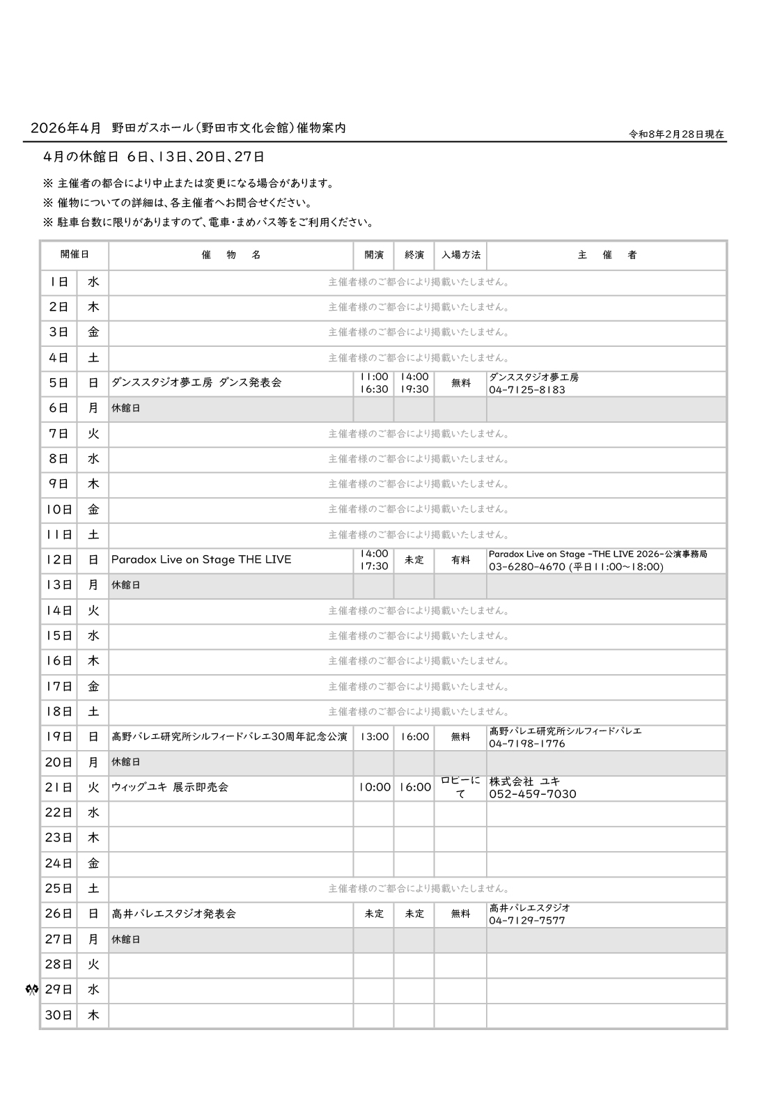 催し物案内(2026年4月)